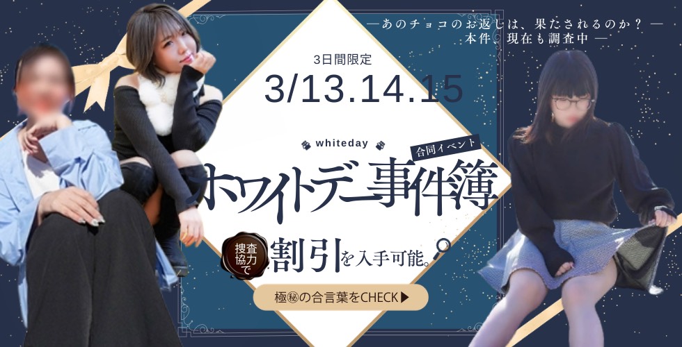 見てみて?本日から ホワイトデーイベント 開催中??♀? 【期間中】 80分以上指名料無料 100分指名料無料?2,000OFF 120分以上指名料無料?3,000OFF 【条件】 ・予約受付時に合言葉を受付に伝える 合言葉は【 準備完了です 】 ・女の子にプレゼントを持参する事 ※既製品の新品のみ対象。 ??手作りは受け取らないでください(お客様向けの注意書きにも書いてます) 会いに来てもらえるのが 1番のプレゼントですので 難しく考えず お得に遊んでもらえたら??♀? ロングの方がお得なので お尻気になってるお兄さんや 攻められてみたいお兄さん いかがですか?? お誘い際合言葉を忘れずに? お誘いお待ちしてます?
